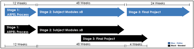 The Programme comprises three stages: Stage 1: ARPEL process is primarily system based and will include one or more online interviews as part of the evaluation process, Stage 2: Course subject modules and Stage 3: final research project. During Stages 2 and 3, in addition to the self-learning elements, students would be required to attend one weekly online tutorial/workshop. The blended learning programme includes and additional weekly support on-site classroom session to guide and support students in the preparation of their coursework.